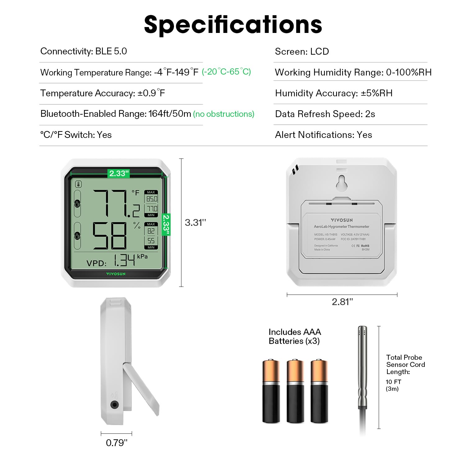 - Remote Control & Smart App Alerts: Connect to Vivosun App via Bluetooth to monitor temperature, humidity, and VPD data remotely; Receive instant notifications when temperatures or humidity exceed your set levels, allowing you to effectively manage the climate in various locations such as your bedroom, greenhouse, grow tent, basement, or baby room