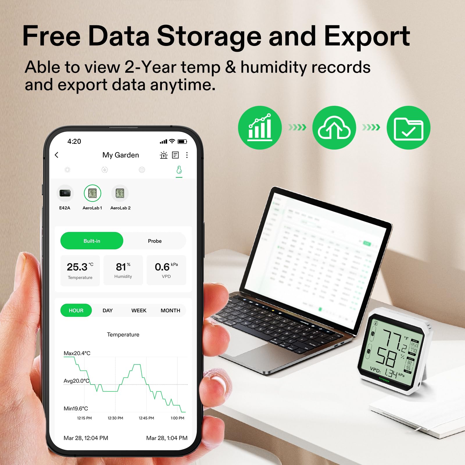- 2-Year Free Data Storage: This indoor temp & humidity gauge offers a 2-year free data storage service, allowing you to analyze the historical temp & humidity data and make adjustments accordingly; You can also easily export the data at any time