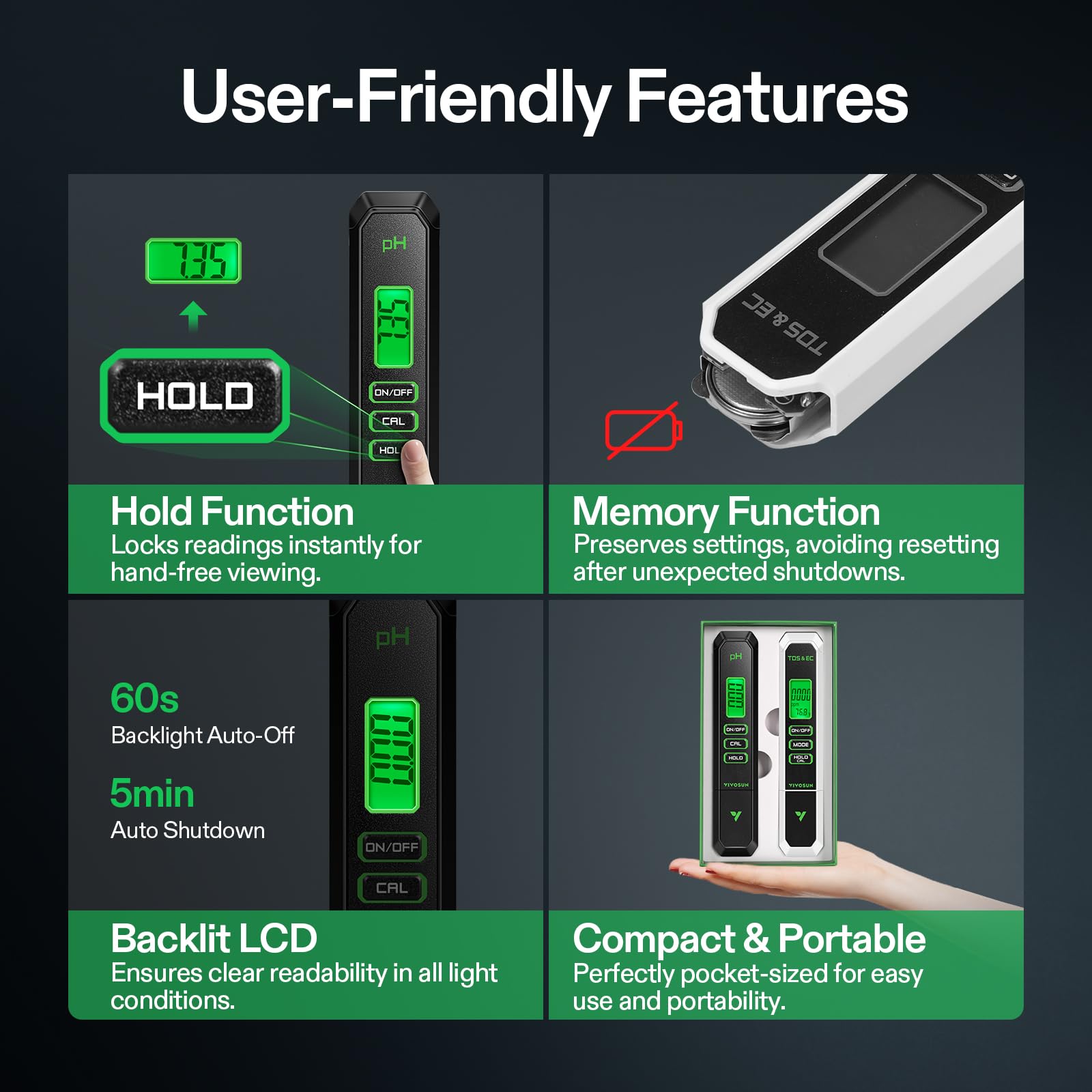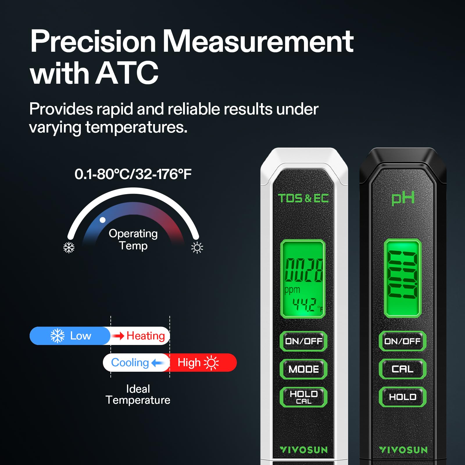 - Precision Measurement with ATC: Equipped with ultra-sensitive electrodes, both testers provide rapid, reliable results; They also feature Automatic Temperature Compensation (ATC) function that adjusts for water temperature variations, so you can always get accurate readings, no matter the temperature conditions