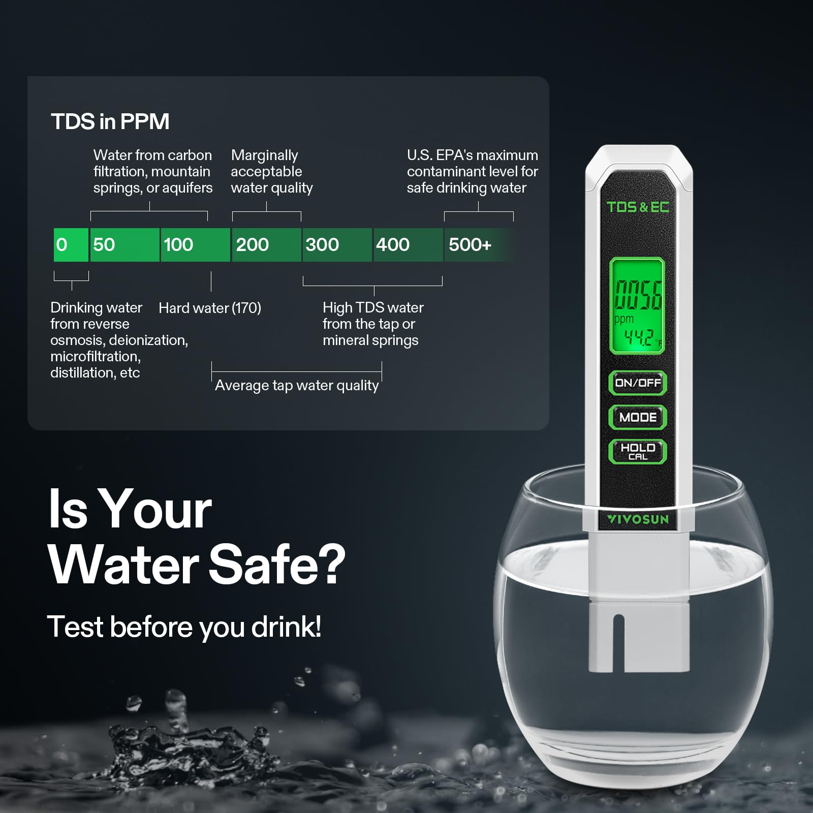 - 3-In-1 TDS Tester: Accurately measures TDS (total dissolved solids), EC (electrical conductivity), and temperature (℃/℉ switchable), meeting your diverse needs; Measuring ranges: 0-9999 ppm TDS, 0-9999 µS/cm EC, 0.1-80℃ / 32-176℉ Temp.