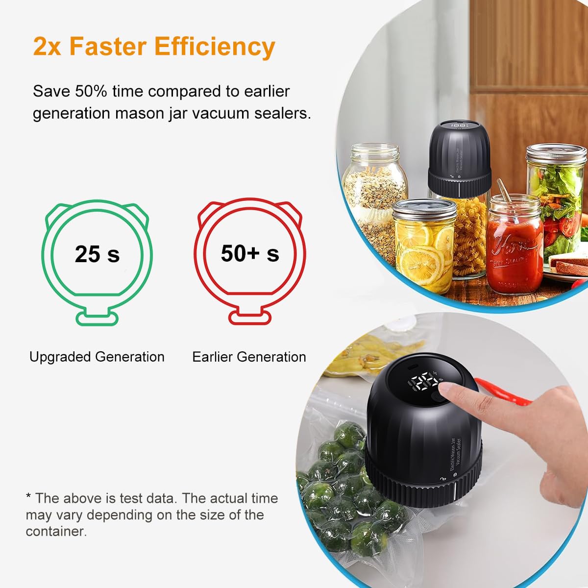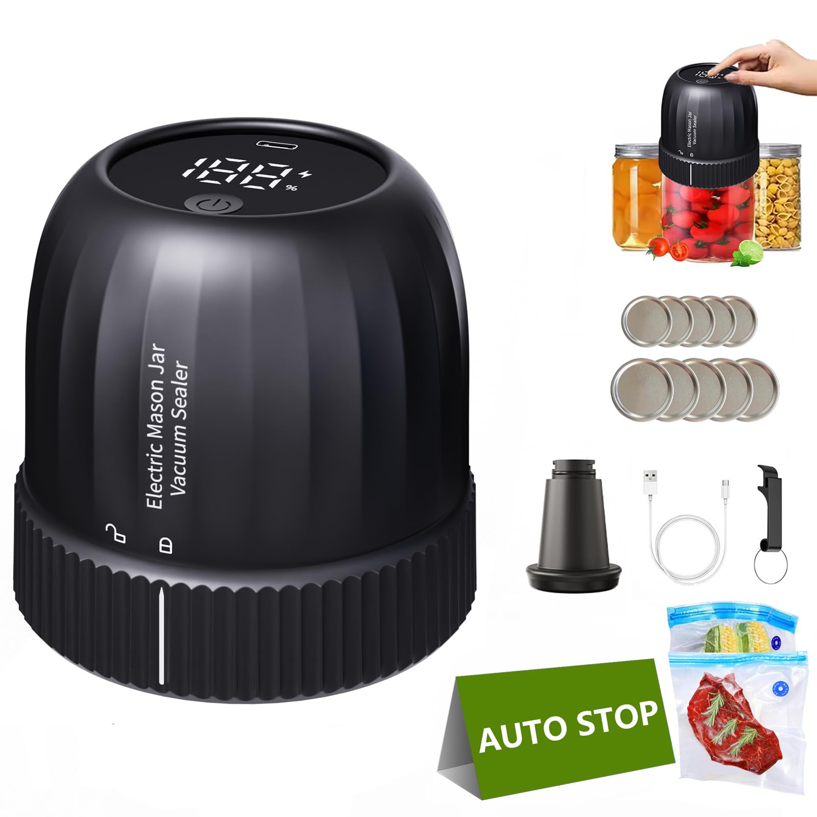 - Auto-Stop, Save Time, and Reduce Mistakes: When used to seal Mason jars, this mason jar vacuum sealer can operate unattended. Just press the button to start, then you can walk away and do other things, saving you a lot of time. The jar sealer automatically stops once the vacuum is complete—no guesswork required. In contrast, other manual-stop vacuum sealers may be stopped at the wrong time and fail to achieve a proper vacuum