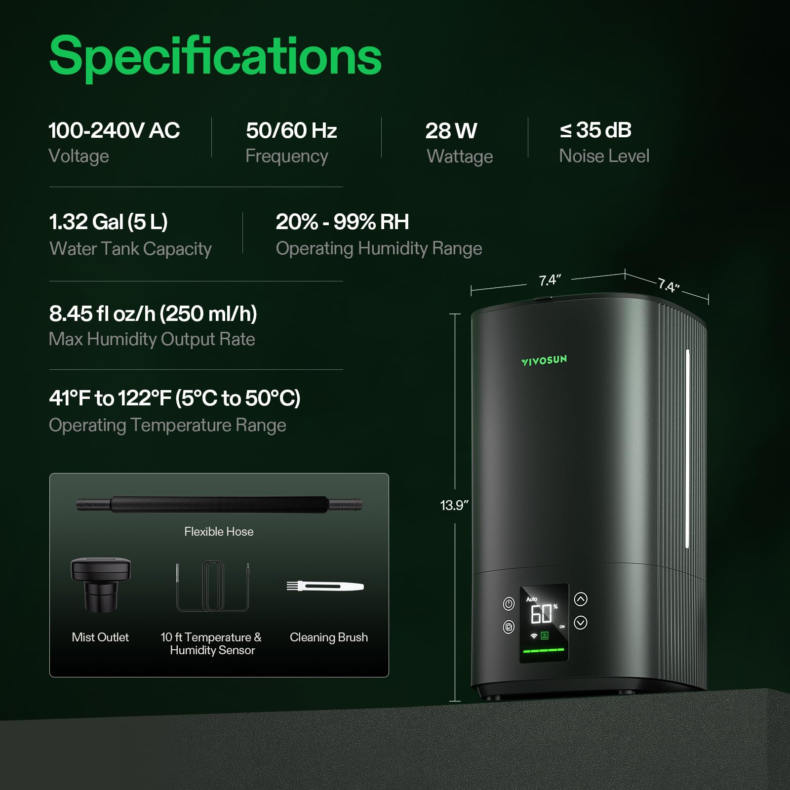 VIVOSUN AeroStream H05 Intelligent Wi-Fi Humidifier, 1.32 Gal / 5 L Humidifier with Temp & Humidity Probe, Smart Remote Control, Designed for Growers